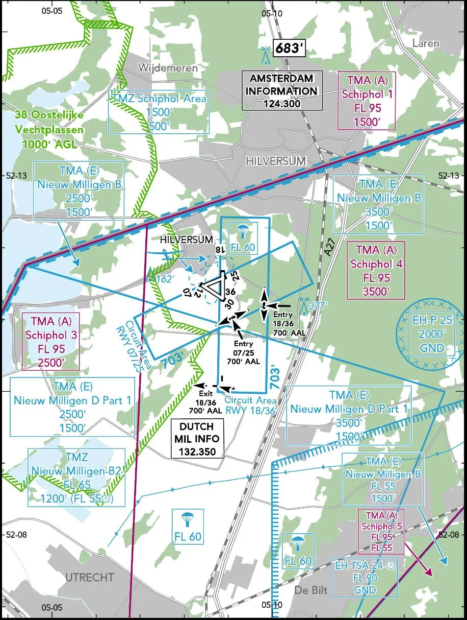 After our stop over, we’ll depart EHRD Rotterdam Airport via the MIKE Departure towards the city of Gouda. After we’ve exited the Rotterdam CTR at MIKE, we’ll briefly follow motorway A20 north before following motorway A12 east towards Utrecht. At Utrecht we can overfly the old city center for some scenic views and head towards the intersection of motorways A27 and A28. From here we’ll turn north towards EHHV Hilversum. Make your choice for your approach to the aerodrome based on the weather conditions and runway in use. A great tool to determine this would be Navigraph Charts, or the charts available in the eAIP from Luchverkeersleiding Nederlands.