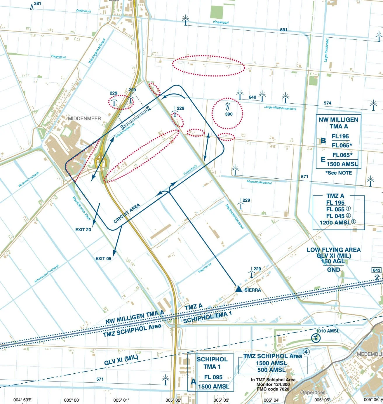 Straight after departing EHHV Hilversum aerodrome, we’re going to contact Schiphol Tower at 121.930. We’re going to request entrance of their CTR via the VICTOR Arrival, cross the airfield mid-field and exit towards Noordwijk. If you’re daring enough you could request an orbit or two around the control tower for sight seeing.